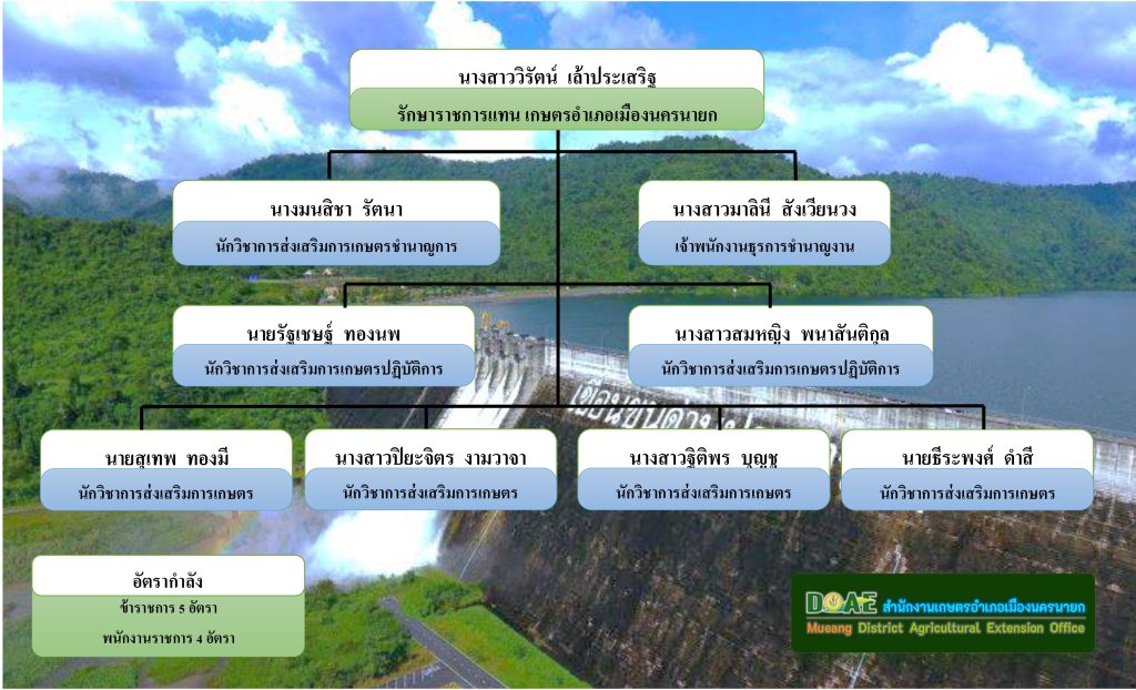 แผนภูมิการแบ่งงานและอัตรากำลัง สำนักงานเกษตรอำเภอเมืองนครนายก ข้าราชการ 5 อัตรา พนักงานราชการ 4 อัตรา