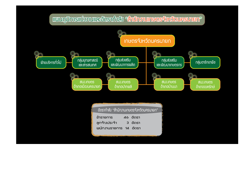 แผนภูมิการแบ่งงานและอัตรากำลัง สำนักงานเกษตรจังหวัดนครนายก อำนาจหน้าที่ ระดับจังหวัด 1. 2. 3. 4. 5. 6. 7. 8. 9. 10. 11. 12. อำนาจหน้าที่ ระดับอำเภอ 1. 2. 3.